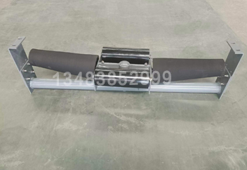 雙中輥調偏托輥組回轉軸焊在下橫梁上,回轉總成(包括組合軸承、回轉軸套)安裝在下橫梁上方,回轉總成外圍設計了可擺動的中托輥橫梁,以回轉軸為中心,在運行膠帶前、后中托輥橫梁上各設置一個中托輥,形成以回轉軸為中心的平衡支撐。側托輥采用加大軸承和軸徑設計,用側托輥軸代替常規(guī)的側托輥橫梁功能。側托輥可拆卸的安裝在兩中輥中間。側托輥為錐形輥設計,錐形輥采用鑄橡膠結構,其在膠帶跑偏時能產生較大的回向阻尼效果,從而使膠帶居中平穩(wěn)運行。